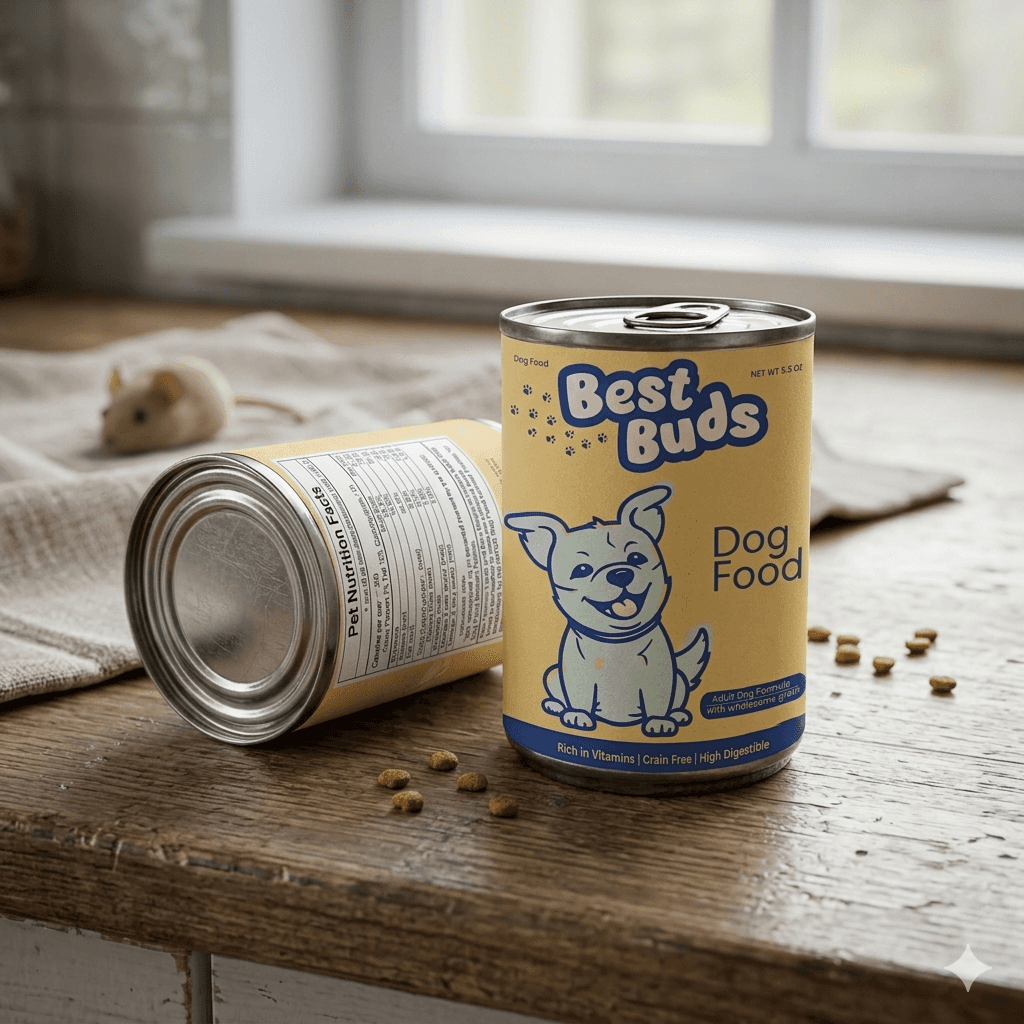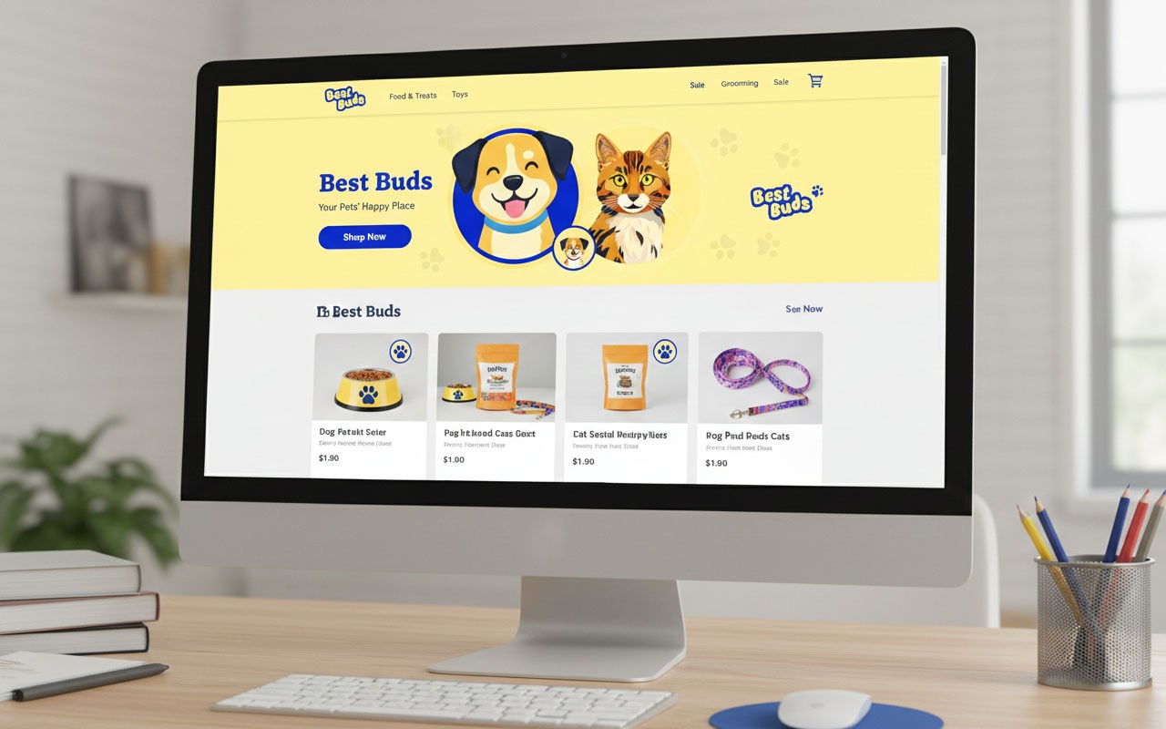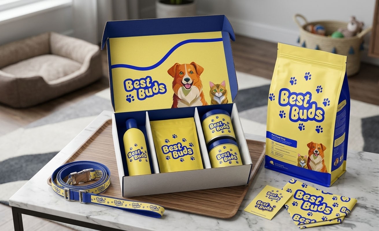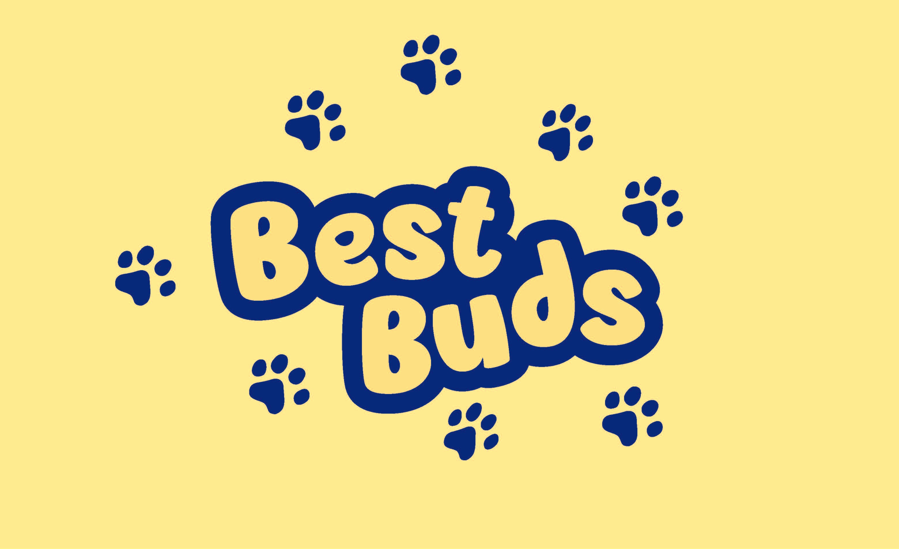 A Best buds, a brand identity for a company specializing in pet food packaging tailored for dichromatic pets using only shades of yellow and blue.