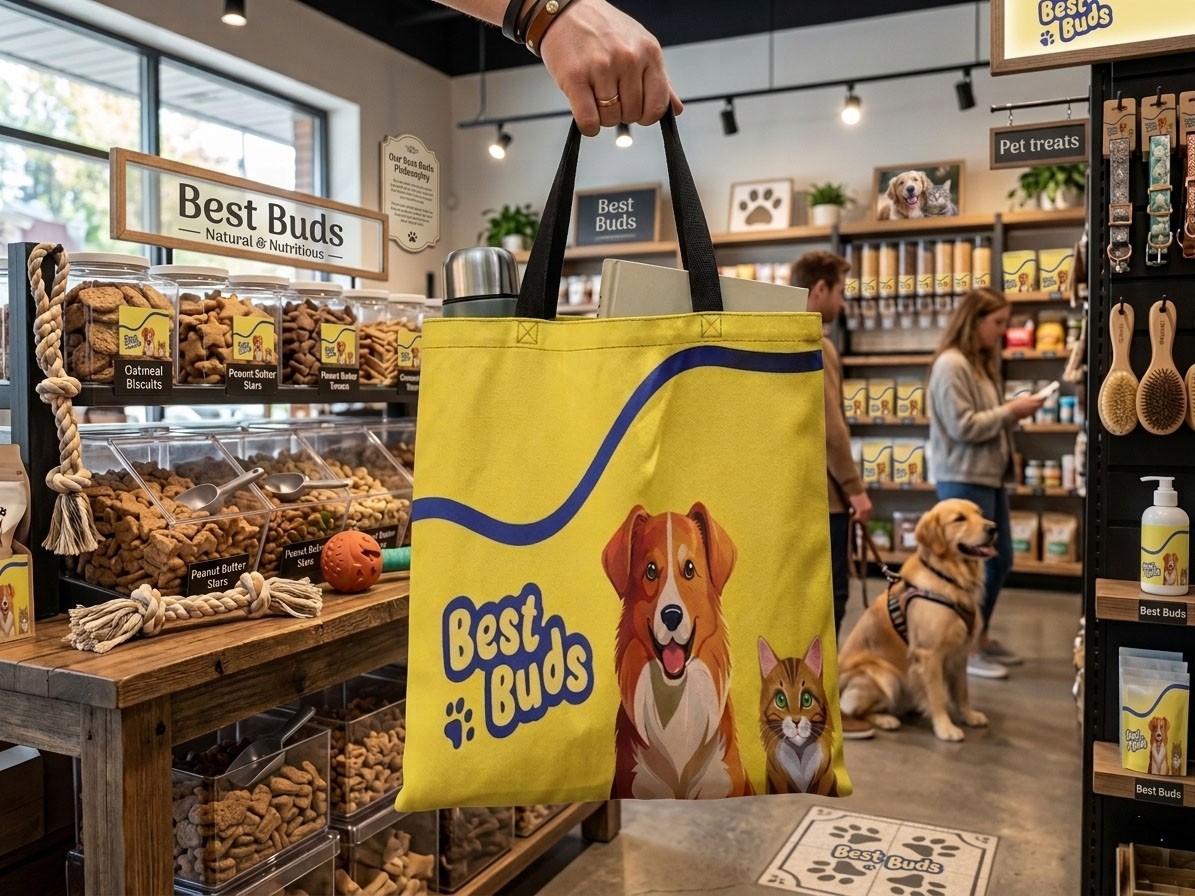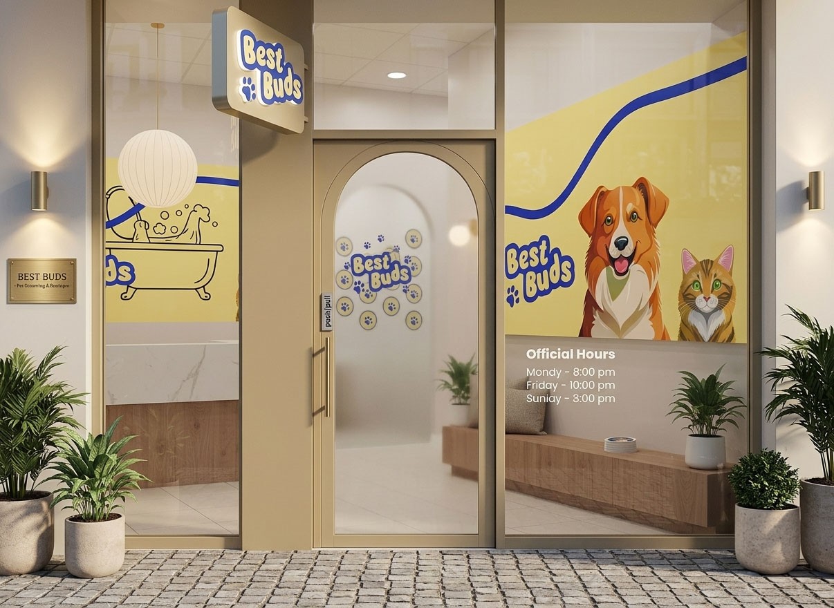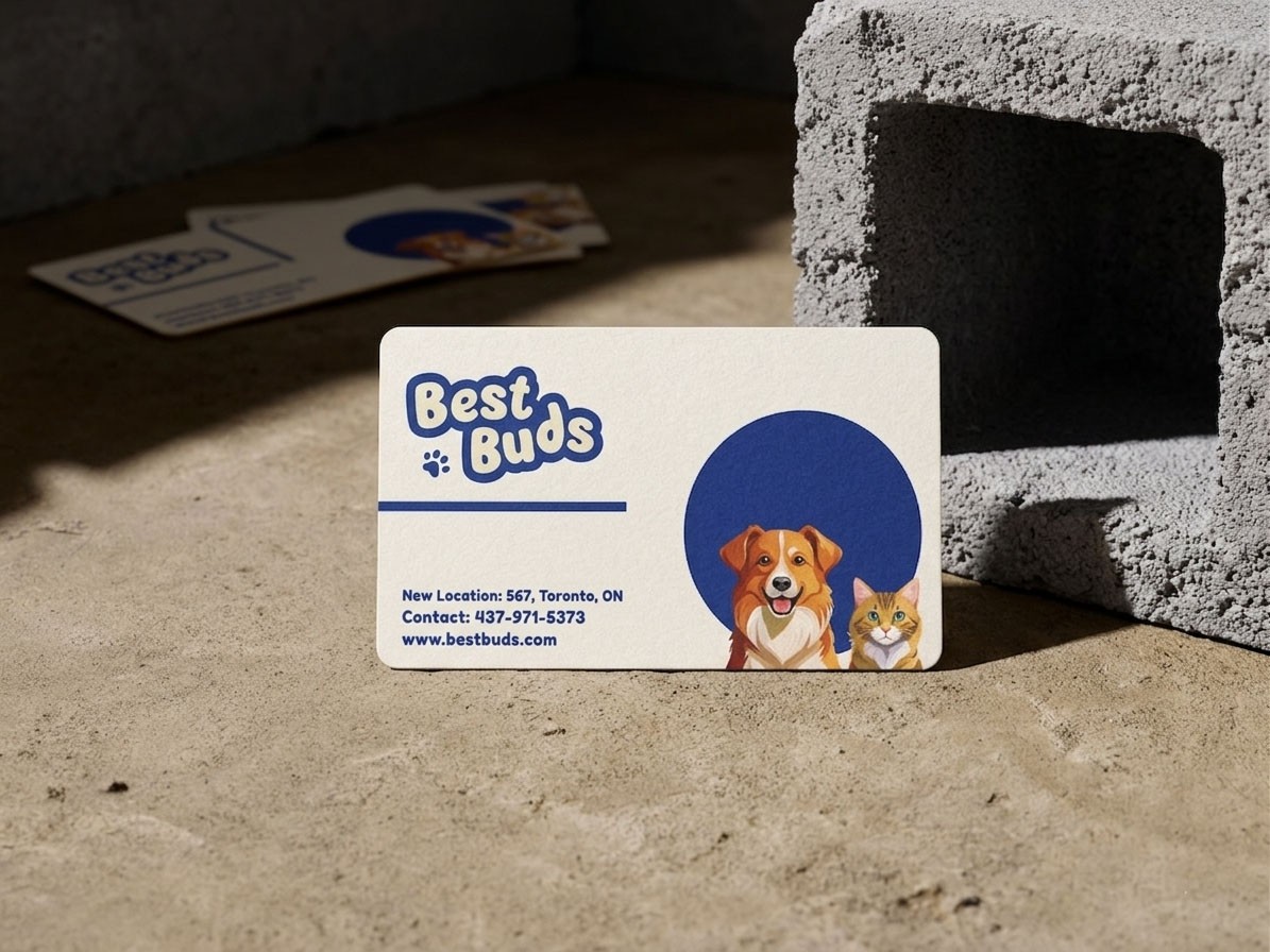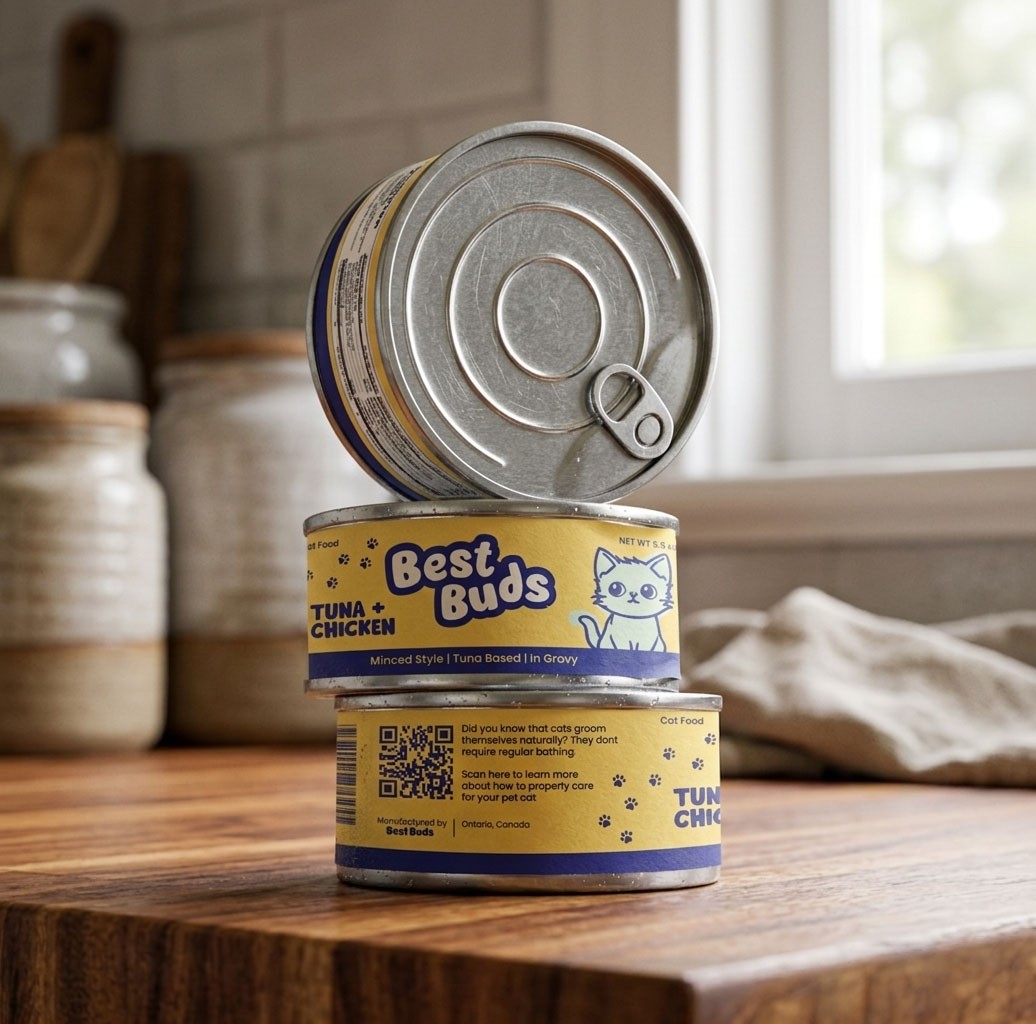 A Best buds, a brand identity for a company specializing in pet food packaging tailored for dichromatic pets using only shades of yellow and blue.